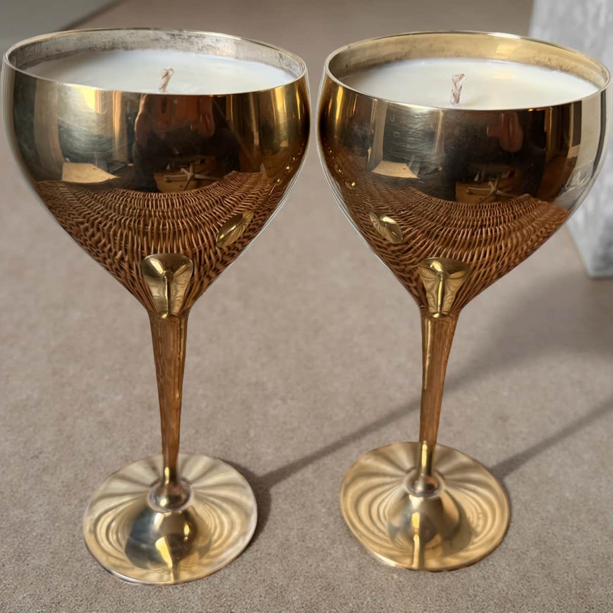 A rare collection of aged golden goblets, lovingly repurposed into richly scented statement candles.