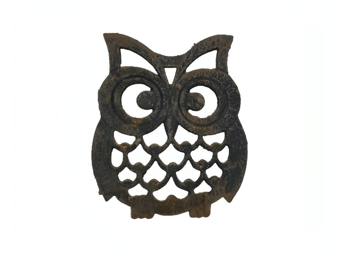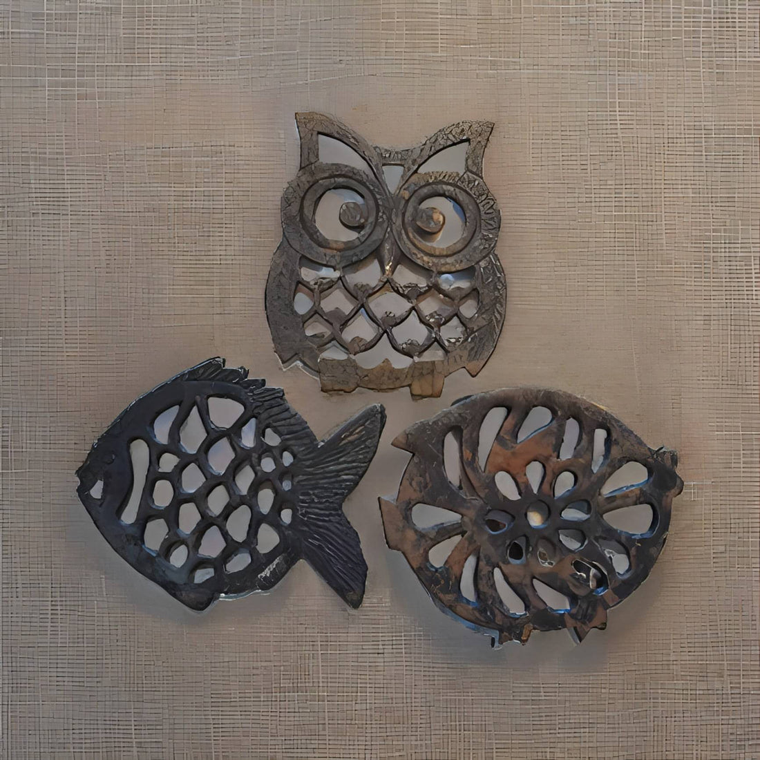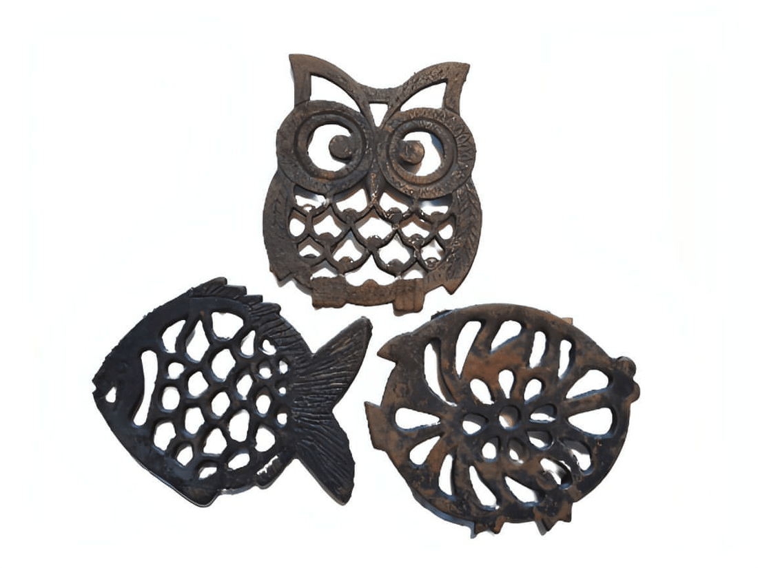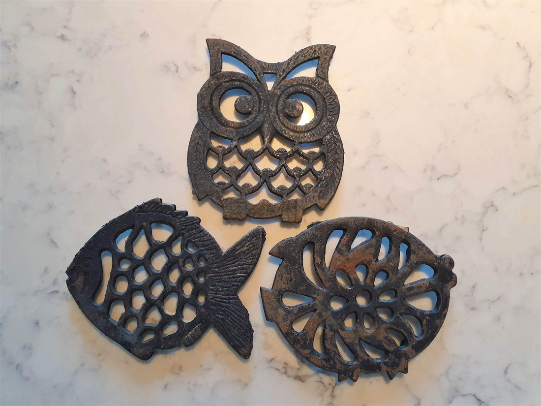 Owl, pig & fish-shaped vintage cast-iron trivets. The cutest Victorian-style work top protectors. Lovely décor for your dining table and kitchen counter.