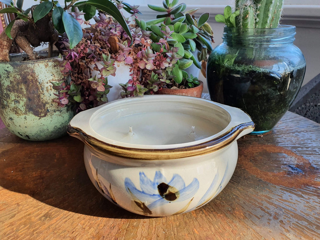 This pottery candle comes with 3 organic cotton wicks and has an approximate burn time of 50 hours. 12cm (width) x 6cm (height).