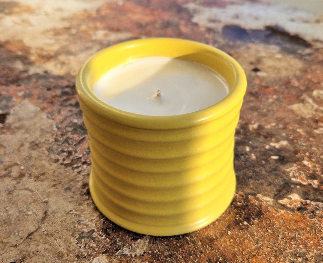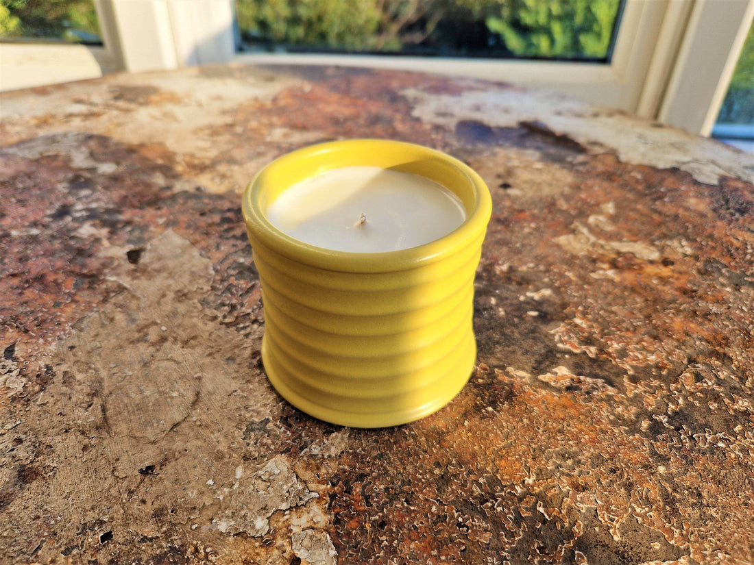 Repurposed yellow honey-pot style candle with our Clove, Honey, Musk fragrance.
