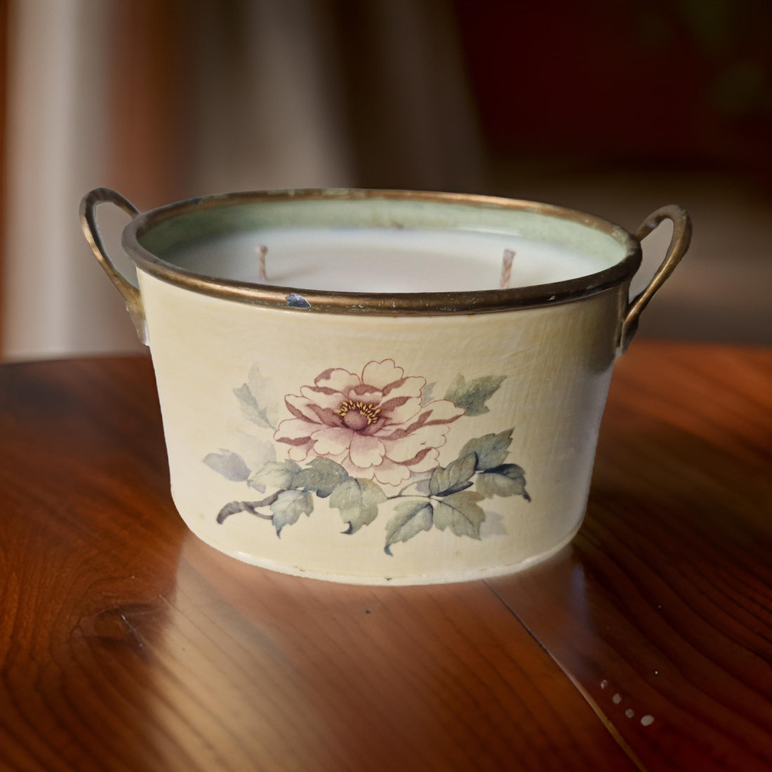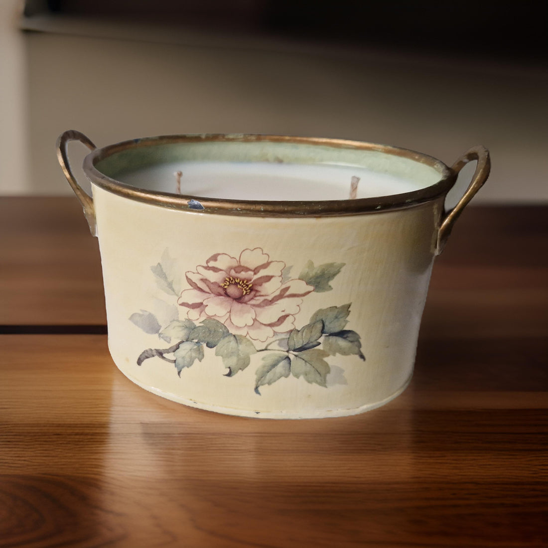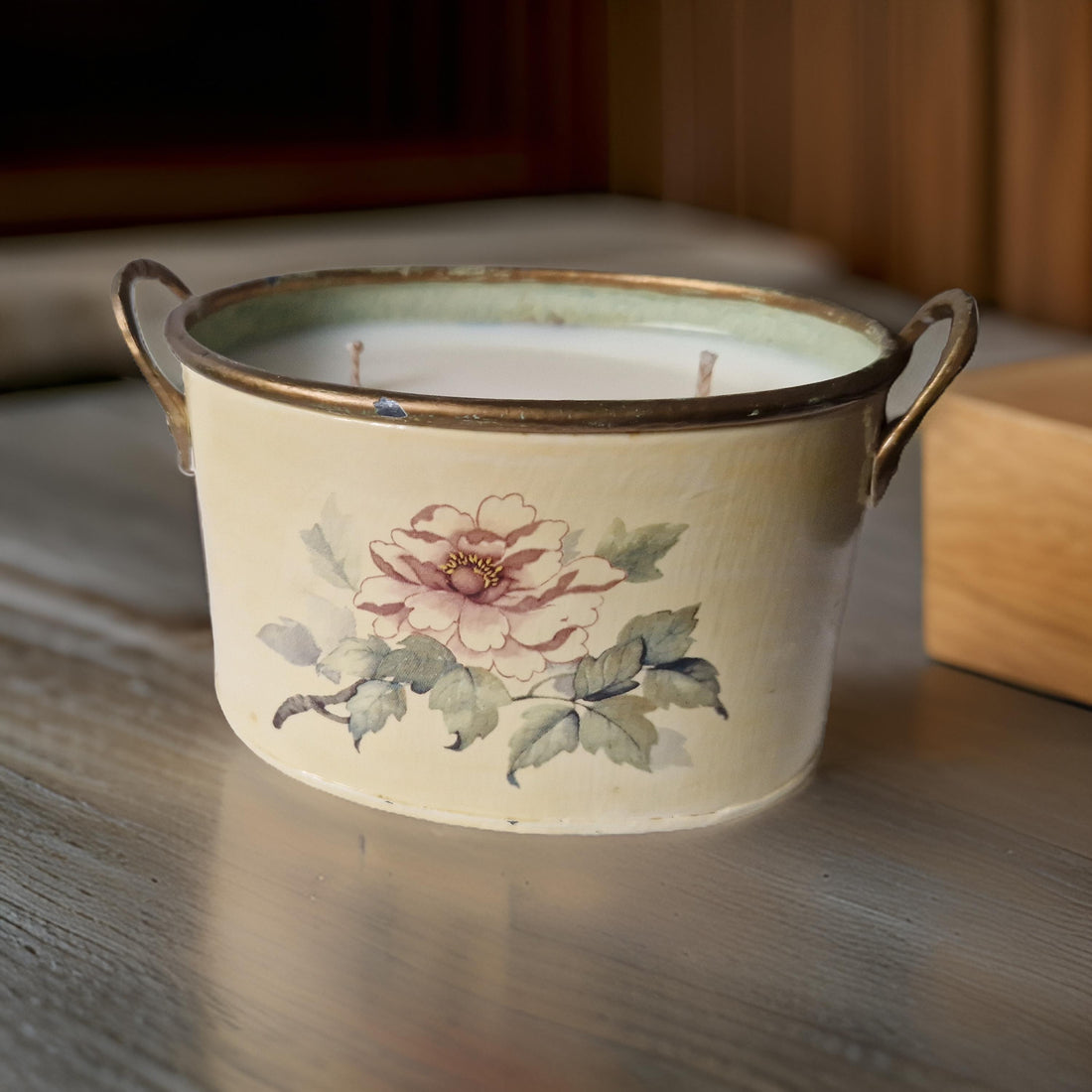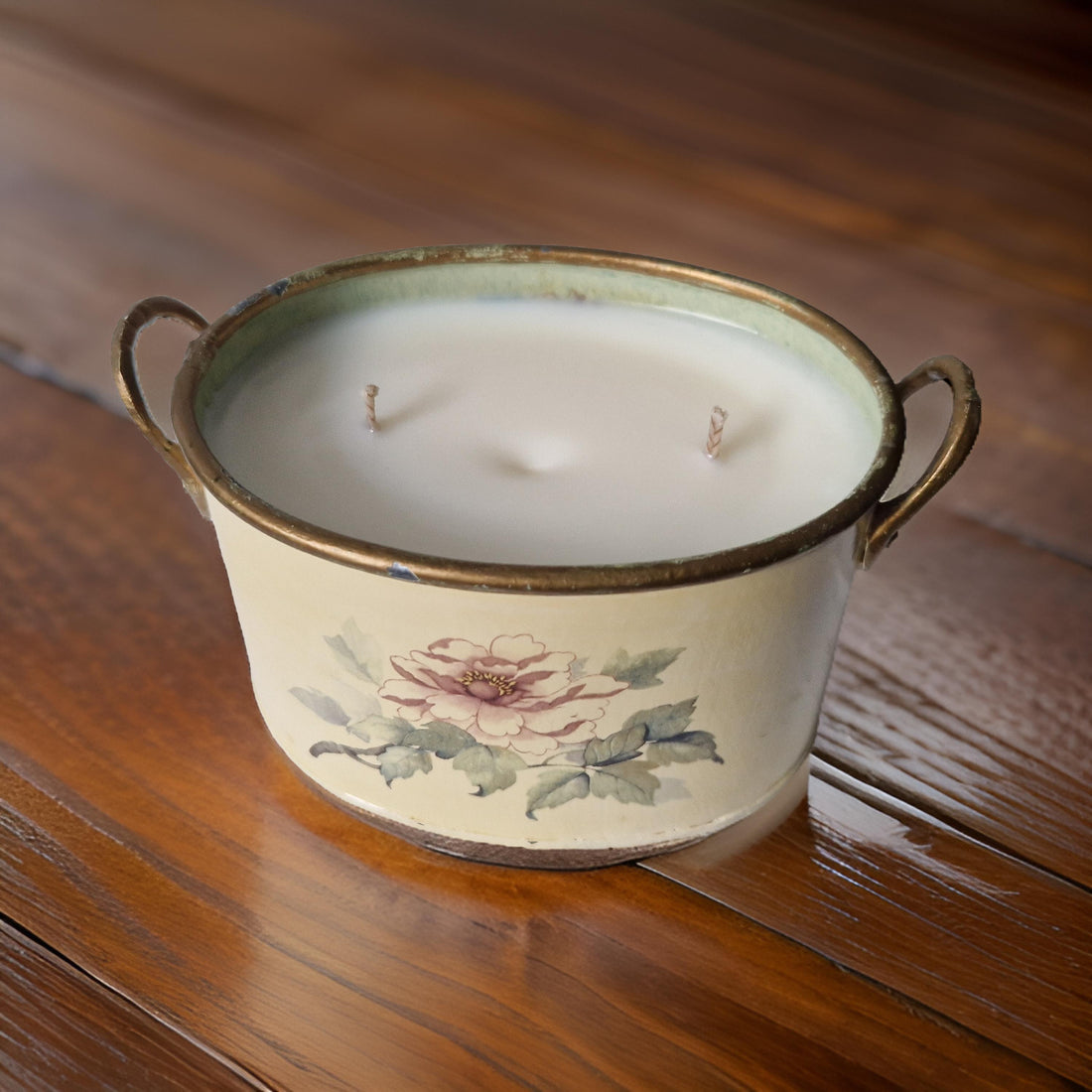 A two-wick candle in a repurposed tin pot, scented with Wild Fig & Oakmoss. Earthy and subtly sweet, this blend balances ripe fig with green, mossy undertones for a grounded, natural aroma.
