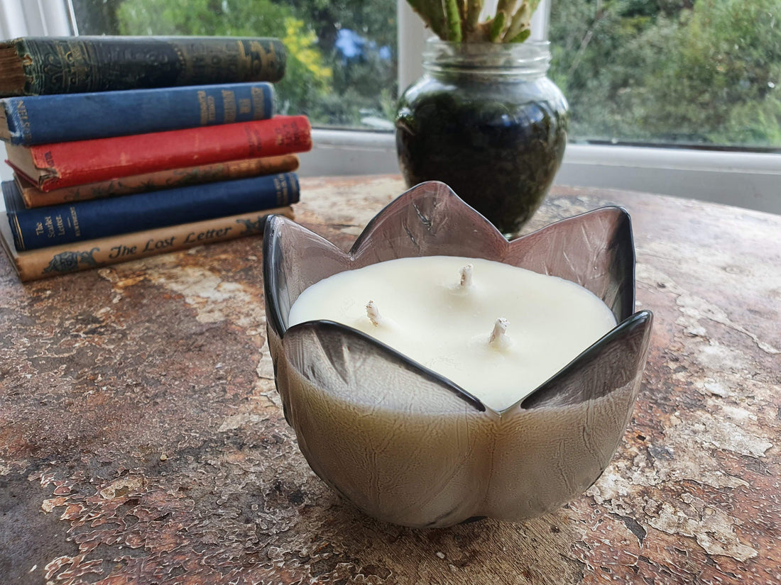 Tinted glass bowl in the shape of a flower with 3 wicks and Bergamot Verbena scented rapeseed wax. A very fresh citrus fragrance with hints of floral notes.