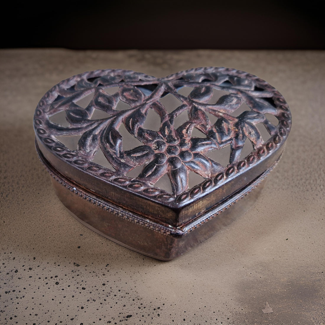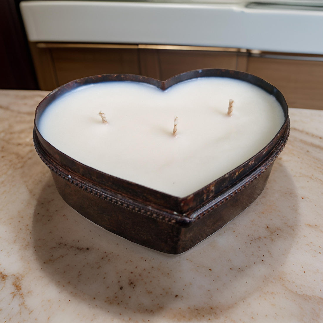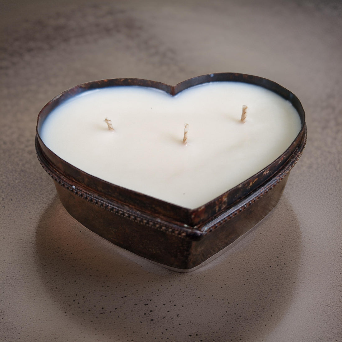 Our repurposed heart shaped candle with lid is filled with our woody Nag Champa fragrance. Fill your home with exotic sandalwood and patchouli.