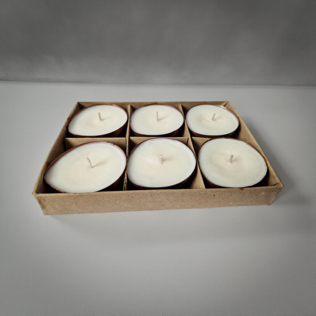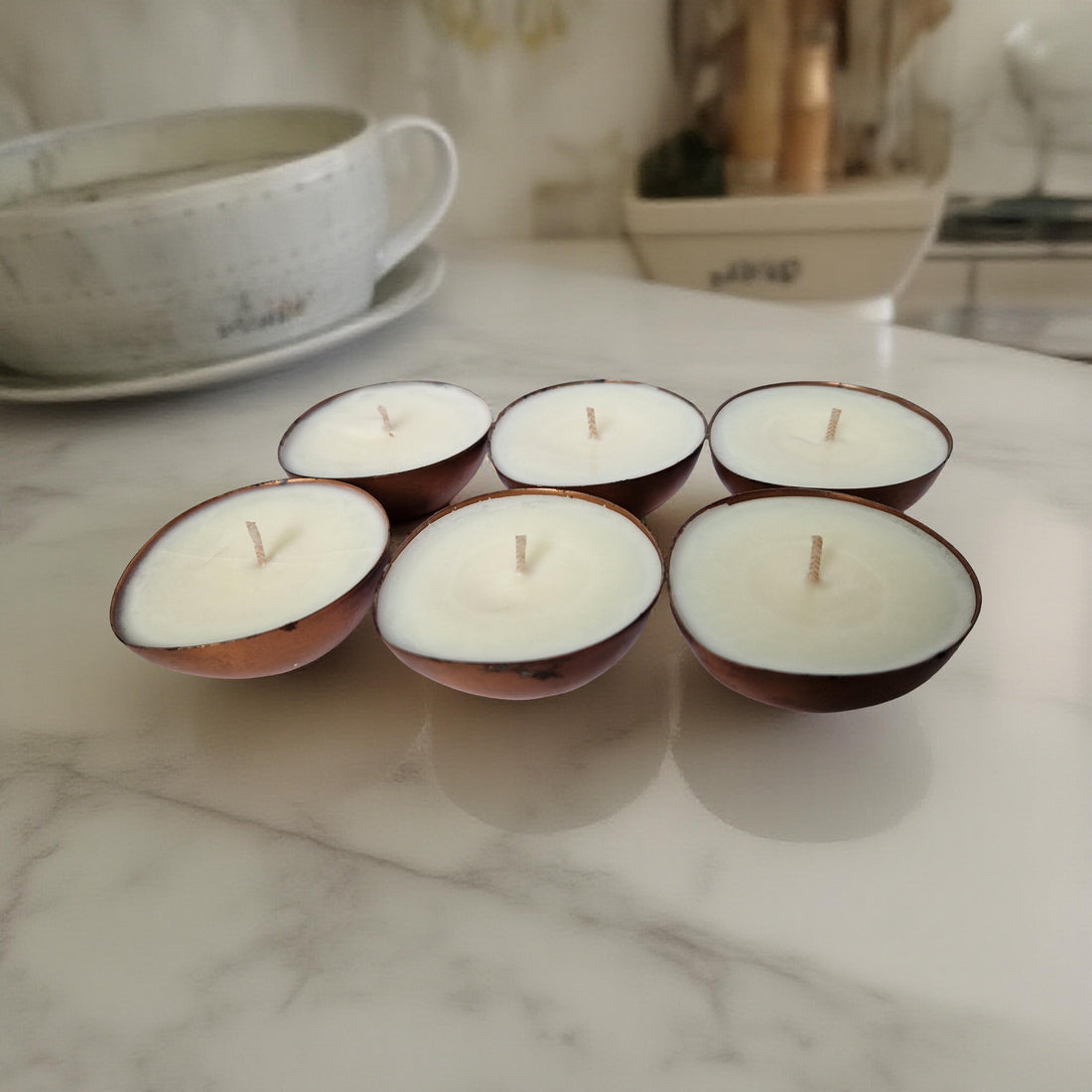 This set of six repurposed Indian tealight holders has been lovingly transformed into elegant Velvet Tonka candles. The fragrance is a sensual blend of lavender, tonka bean, vanilla and golden amber.