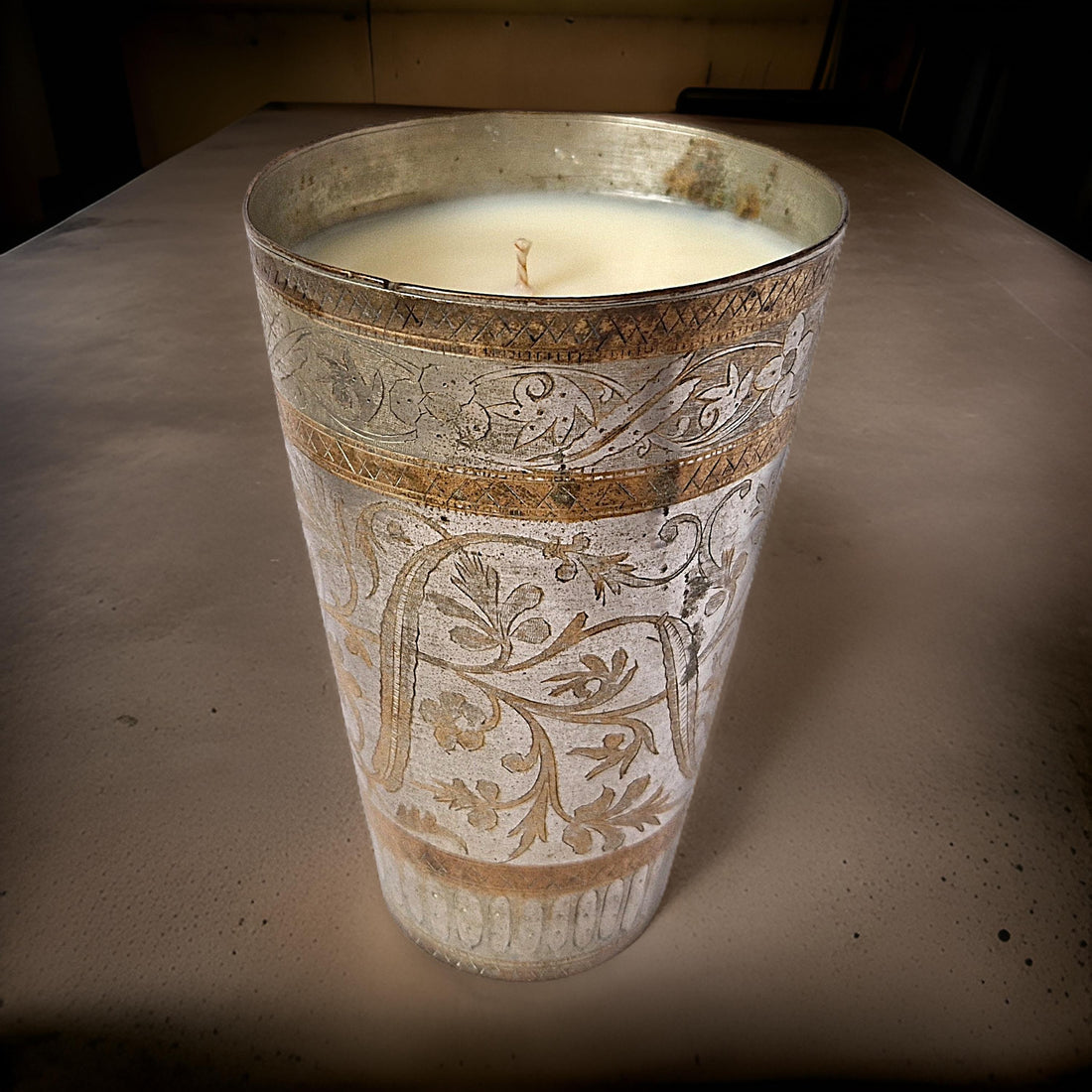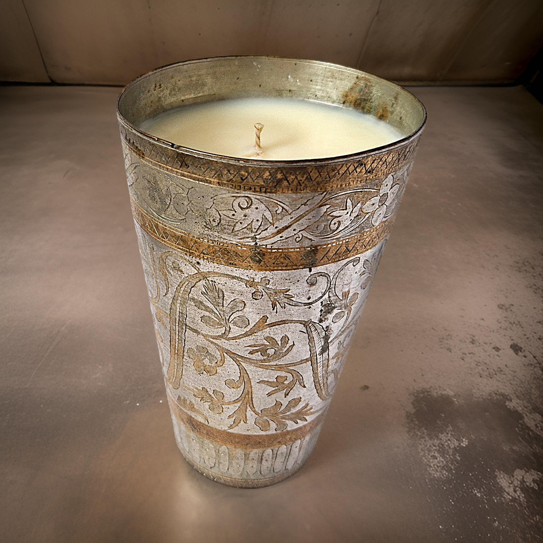 Timeless craftsmanship meets sustainable luxury in our Repurposed Etched Metal Cup Candle in Velvet Tonka. This one-of-a-kind candle is hand-poured into an upcycled metal cup adorned with intricate floral etchings, blending history with modern eco-consciousness. The rich scent of Velvet Tonka unfolds with fresh lavender and armoise, a heart of cinnamon and orris, and a velvety base of tonka bean, vanilla, and golden amber.