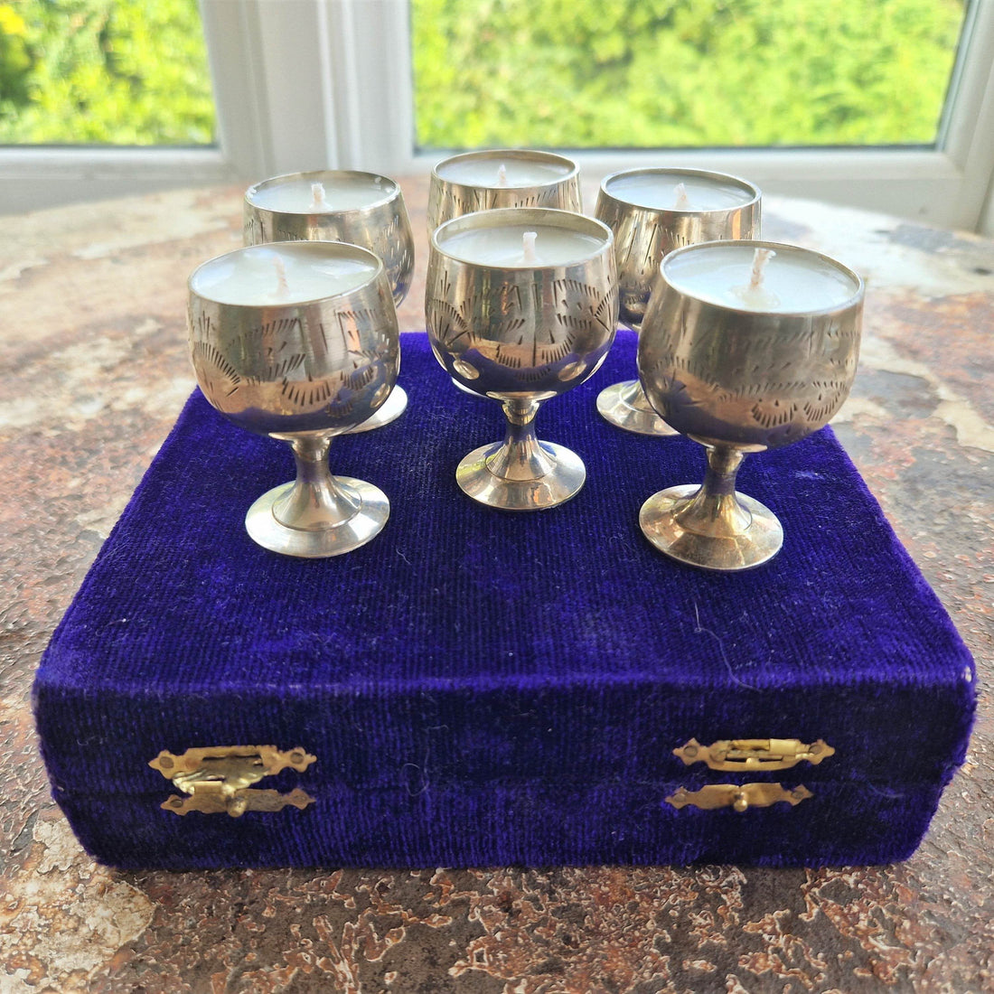 This charming set features 6 mini EPNS goblets upcycled into eco-friendly soy candles with rich, woody scents. The set includes 3 candles each of Vintage Bookshop and Honey & Molten Amber fragrances.